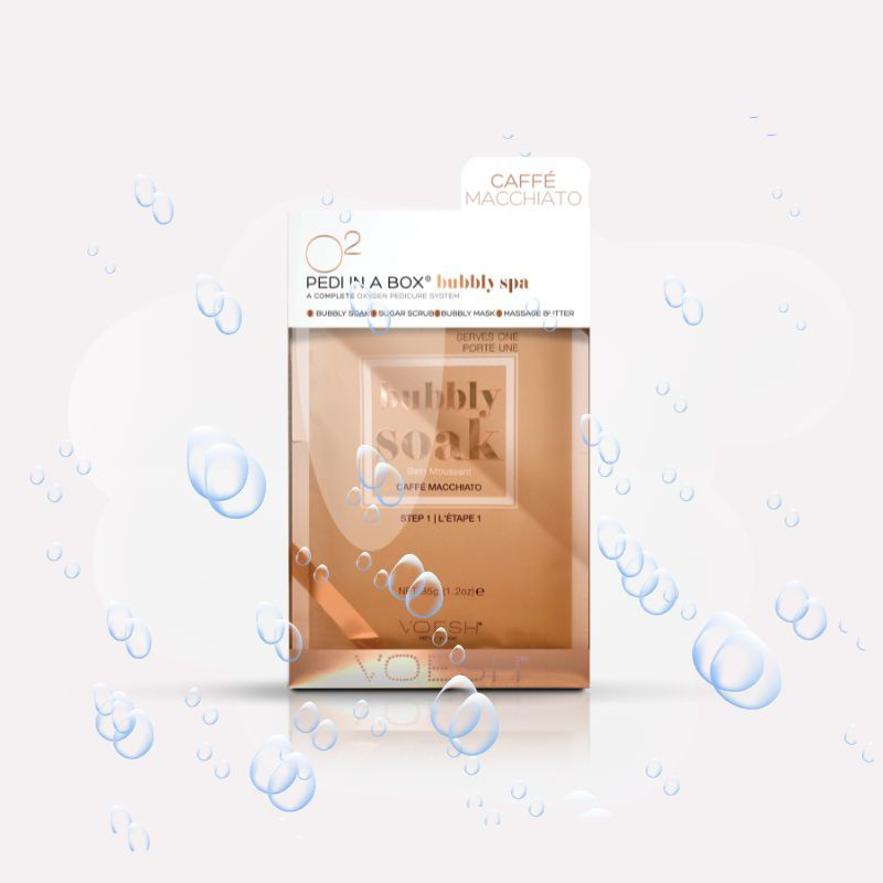 Skøn pedicuresæt med den skønneste O2 maske, som bobler som champagne. Produkterne i dette kit har en rensende effekt og opfrisker huden. Giver dig en luksuriøs oplevelse med en mild skøn duft af kaffebønne. Kittet består af 4 step, som er nøje afmålt til din behandling.